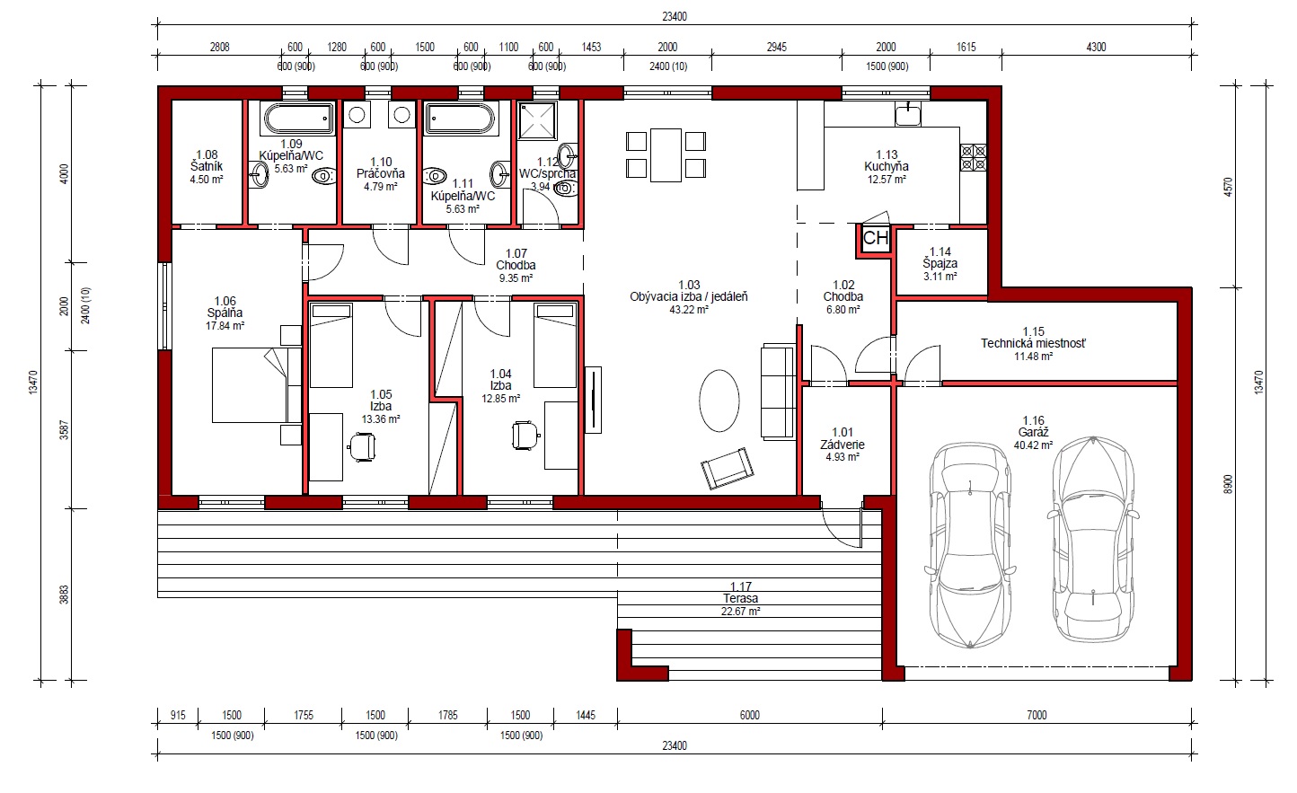 U tohoto projektu nabízíme MOŽNOST BEZPLATNÉ ZMĚNY DISPOZICE! Všechny projekty je možné dodat jako energetickou třídu A0 nebo A1. U každého projektu jsme sa snažili vymyslet tu nejlepší dispozici, jaká je vzhledem k vnějším rozměrům domu možná. I přesto je často nutné dispozici domu upravit s přihlédnutím k osazení domu na pozemek, preference klienta, nebo stavební systém. Nabízíme Vám proto možnost bezplatné změny dispozice každého našeho projektu tak, aby vyhovoval vašim potřebám. Změnou dispozice myslíme posuny nenosných příček, změnu umístění a velikosti oken, interiérových dveří a rozvodů instalací. Cena výstavby uvedená u projektu je za provedení kategorie A1 na klíč, bez interiérového vybavení a bez základů. Pro více informací a aktualizaci ceny nás prosím kontaktujte.