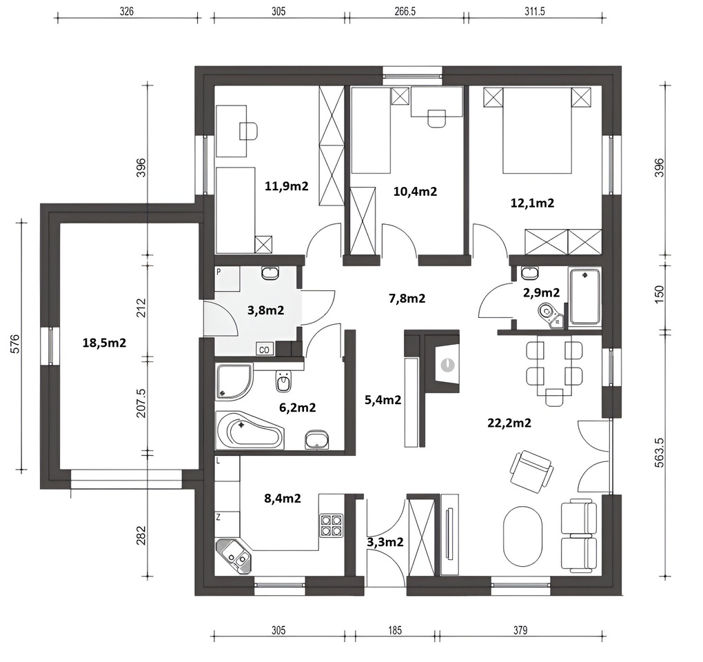 U tohoto projektu nabízíme MOŽNOST BEZPLATNÉ ZMĚNY DISPOZICE! Všechny projekty je možné dodat jako energetickou třídu A0 nebo A1. U každého projektu jsme sa snažili vymyslet tu nejlepší dispozici, jaká je vzhledem k vnějším rozměrům domu možná. I přesto je často nutné dispozici domu upravit s přihlédnutím k osazení domu na pozemek, preference klienta, nebo stavební systém. Nabízíme Vám proto možnost bezplatné změny dispozice každého našeho projektu tak, aby vyhovoval vašim potřebám. Změnou dispozice myslíme posuny nenosných příček, změnu umístění a velikosti oken, interiérových dveří a rozvodů instalací. Cena výstavby uvedená u projektu je za provedení kategorie A1 na klíč, bez interiérového vybavení a bez základů. Pro více informací a aktualizaci ceny nás prosím kontaktujte.