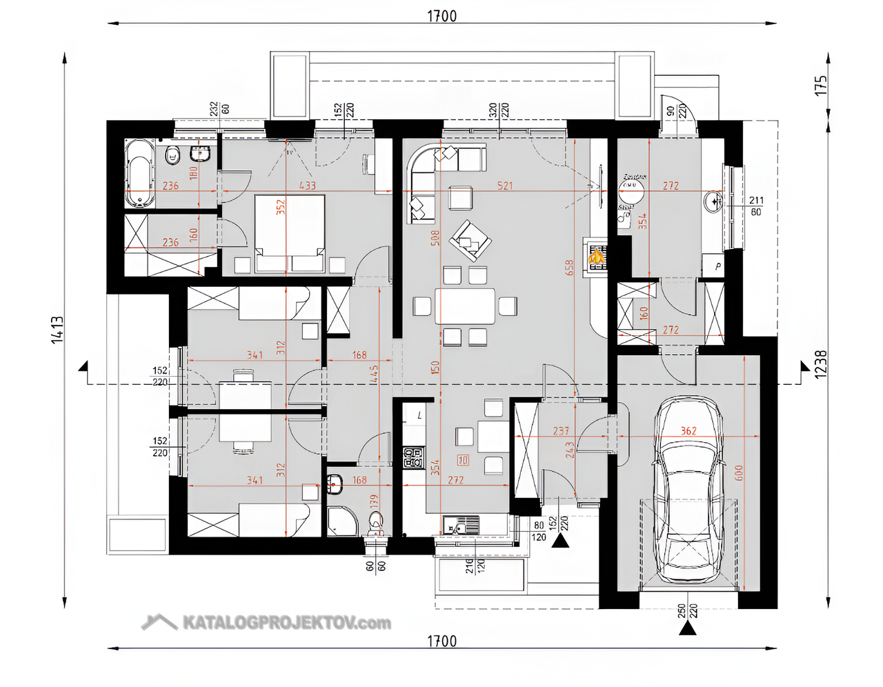 U tohoto projektu nabízíme MOŽNOST BEZPLATNÉ ZMĚNY DISPOZICE! Všechny projekty je možné dodat jako energetickou třídu A0 nebo A1. U každého projektu jsme sa snažili vymyslet tu nejlepší dispozici, jaká je vzhledem k vnějším rozměrům domu možná. I přesto je často nutné dispozici domu upravit s přihlédnutím k osazení domu na pozemek, preference klienta, nebo stavební systém. Nabízíme Vám proto možnost bezplatné změny dispozice každého našeho projektu tak, aby vyhovoval vašim potřebám. Změnou dispozice myslíme posuny nenosných příček, změnu umístění a velikosti oken, interiérových dveří a rozvodů instalací. Cena výstavby uvedená u projektu je za provedení kategorie A1 na klíč, bez interiérového vybavení a bez základů. Pro více informací a aktualizaci ceny nás prosím kontaktujte.